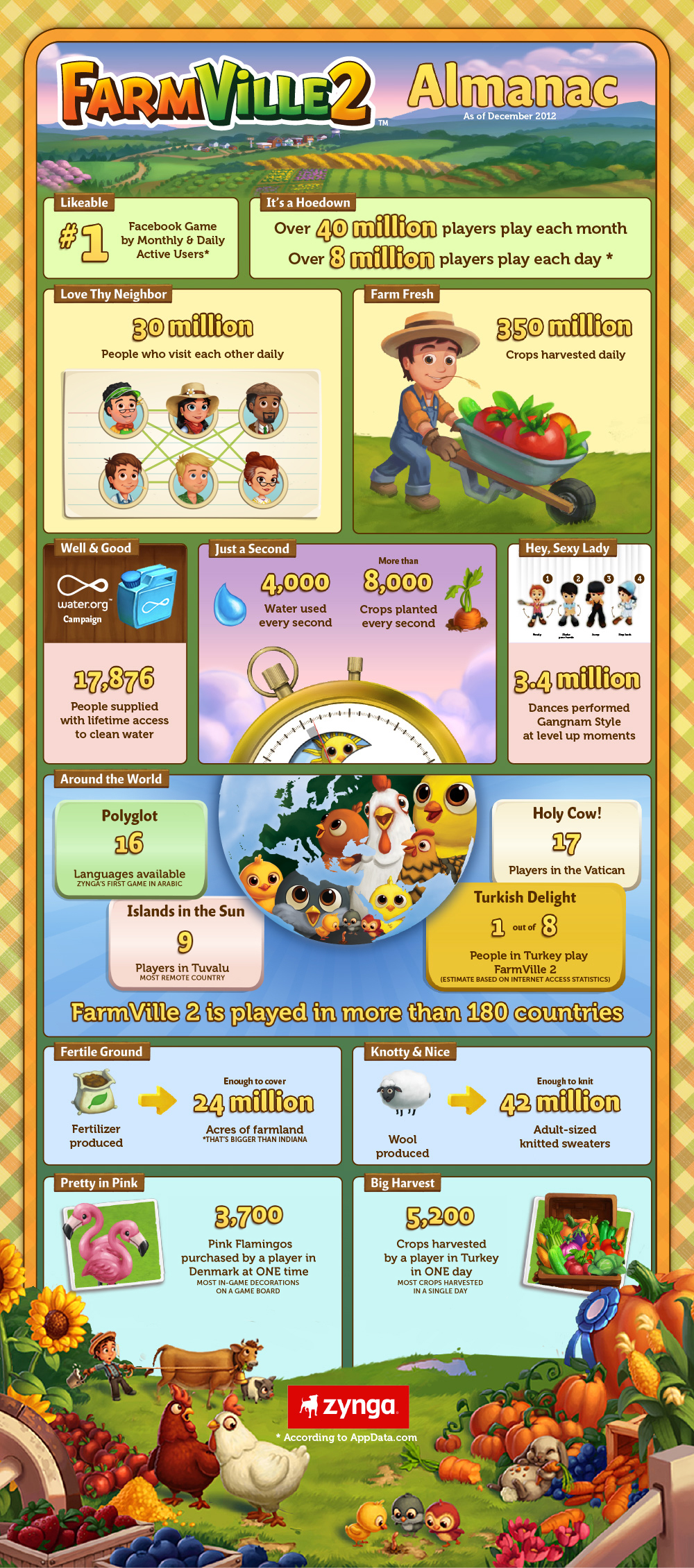 A seguire c’è un’immagine infografica rilasciata da Zynga che mostra nuovi dati. E si parla di 180 Paesi dove viene giocato FarmVille 2 e 17.876 persone che hanno ottenuto accesso illimitato ad acqua pulita grazie alla campagna Water.org collegata al social game.