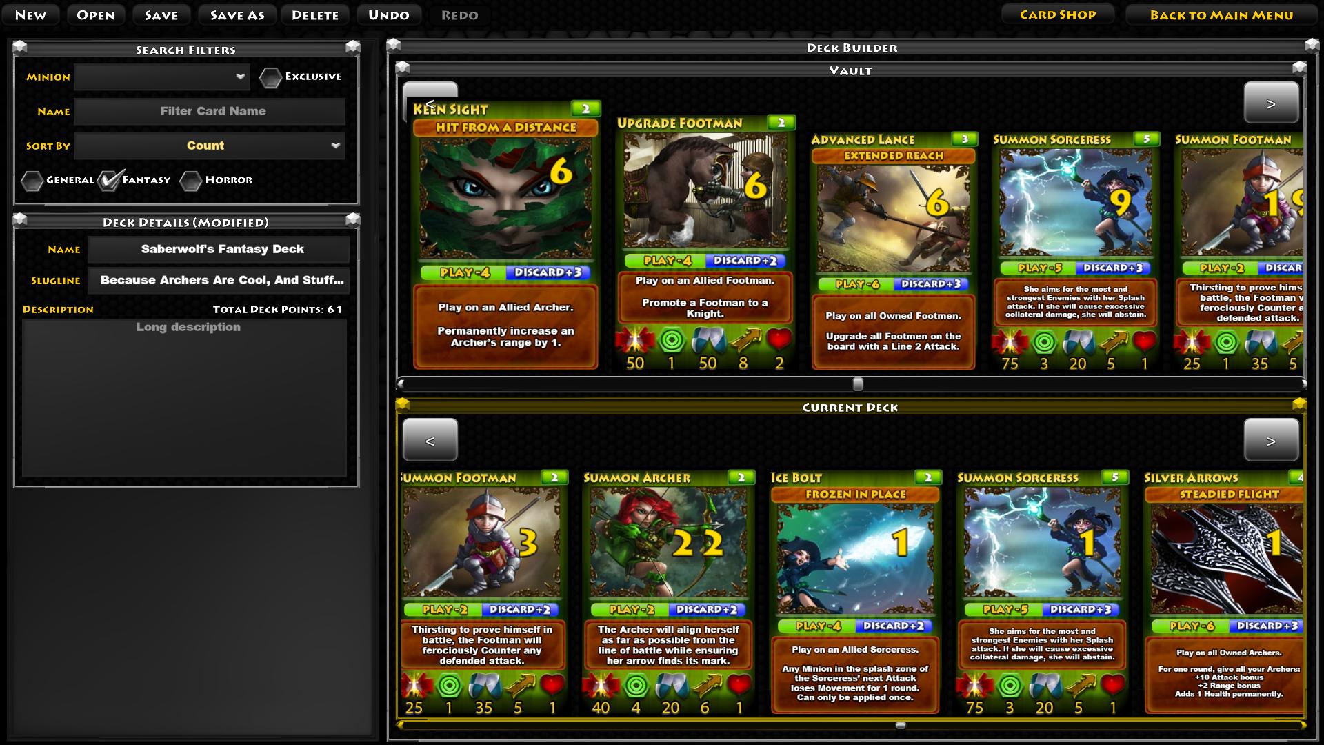 Per far questo, i giocatori dispongono del proprio mazzo di carte con il quale decidono ad inizio di ogni turno, le azioni da fare. Tali carte (cinque per mano) possono essere creature (cavalieri, goblin, zombie, sciamani, arcieri e così via), mana o potenziamenti di vario genere.