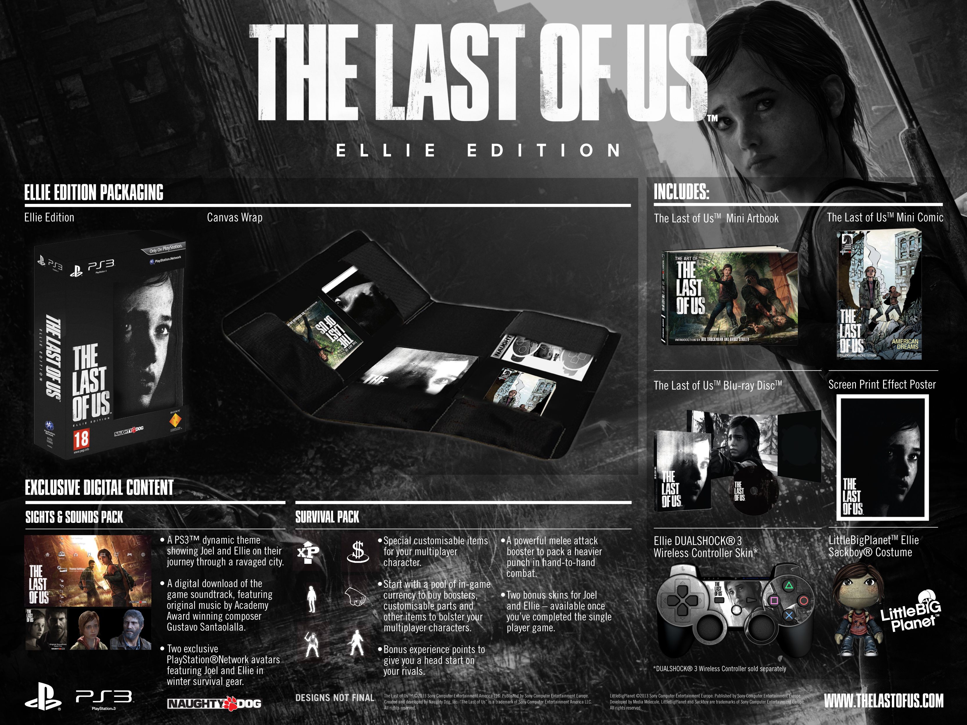 Il resto dei ricchi contenuti è uguale. Si tratta di un mini artbook firmato da Dark Horse (e questo potrebbe interessare molti collezionisti), il fumetto The Last of Us: American Dreams (il primo fumetto che parla della storia di Ellie) e i contenuti bonus digitali (Survival Pack per il multiplayer, moneta extra ingame, punti esperienza aggiuntivi, un potenziamento per gli attacchi corpo a corpo, un tema dinamico XMB, la colonna sonora, due avatar PSN e due skin aggiuntive per Joel e Ellie che saranno accessibili dopo aver concluso la campagna single-player.