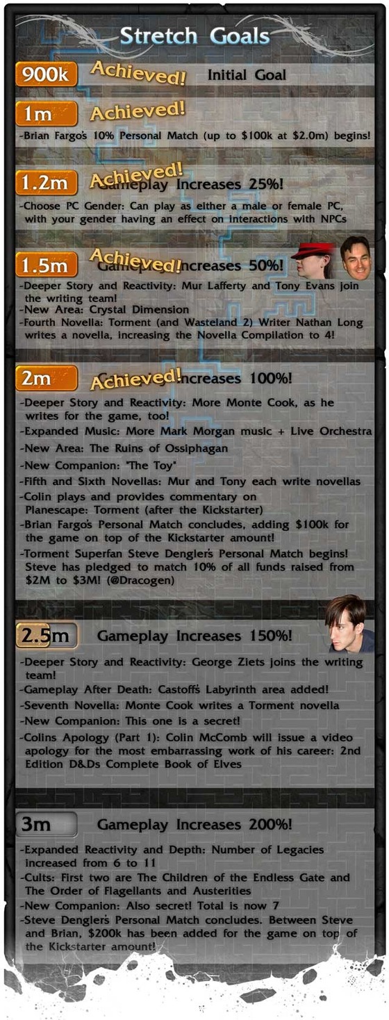 Tra le tante caratteristiche che verranno aggiunte, raggiunta questa soglia, segnaliamo il fatto che il gameplay sarà aumentato del 150% ed inoltre Geoge Ziets, creativo che ha contributo alla realizzazione di Neverwinter Nights 2: Mask of the Betrayer, si unirà al team di sviluppo. Saranno aggiunte ulteriori novità nella narrazione (che si preannuncia fin da ora molto articolata) e nel gioco con Monte Cook, autore dell’ambientazione cartacea (Numenera) ancora più attivo nella controparte videoludica.