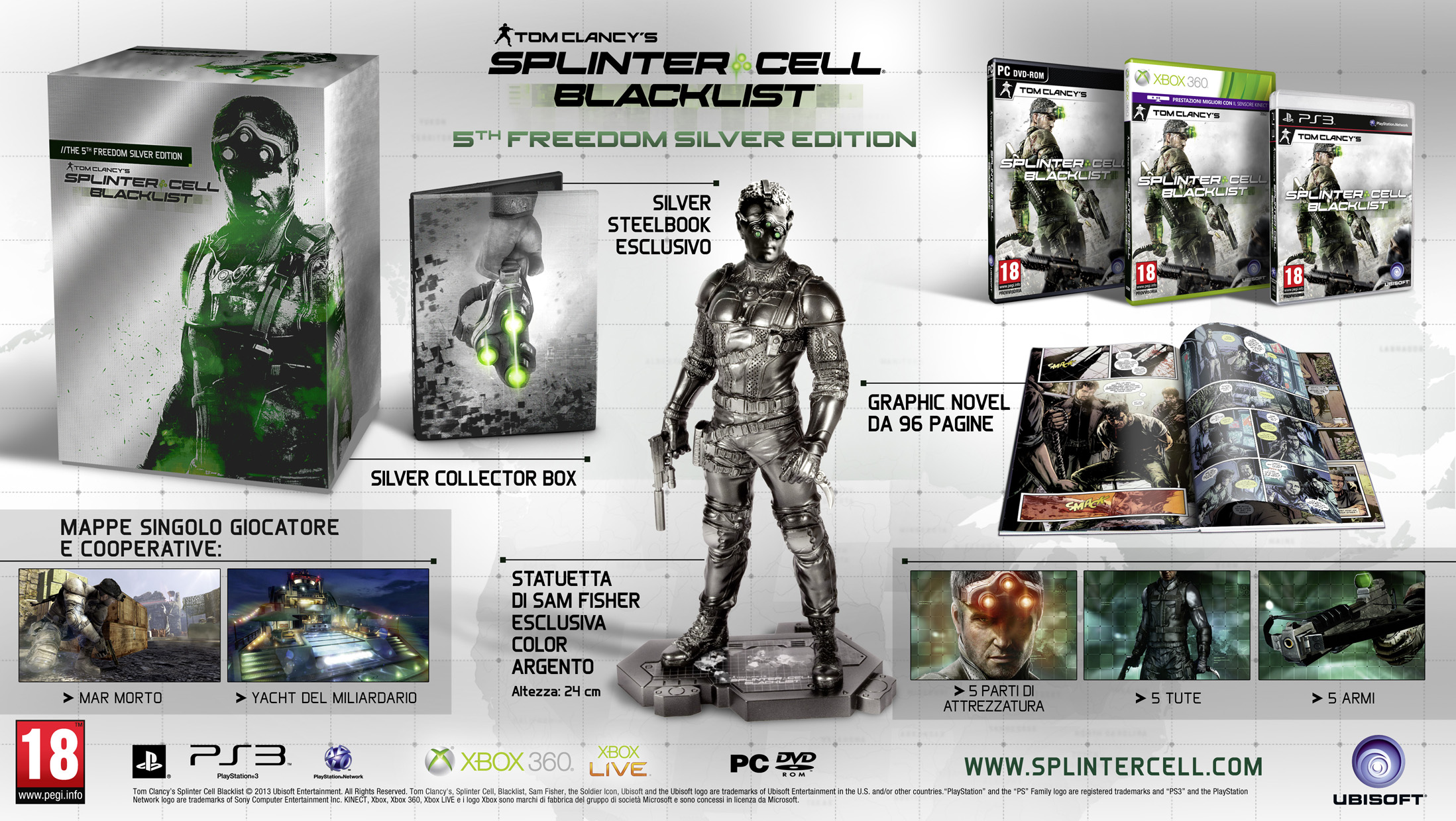 I contenuti della 5th Freedom Silver Edition di Splinter Cell: Blacklist sono illustrati in questo video sull’unboxing. Si tratta dell’edizione più ricca per i fan di Sam Fisher. Oltre al gioco (non sveniamo per la sorpresa) la confezione includerà una statuetta di Sam color argento, il fumetto Splinter Cell Echoes di 96 pagine, una Silver Steelbook, il Silver Collector Box. Acquistare questa edizione vi darà accesso a diversi contenuti da sbloccare come le mappe del Mar Morto e lo Yacht del Miliardario. Ci sarà anche l’attrezzatura extra, armi comprese. Il video spiega però di più di mille parole.
