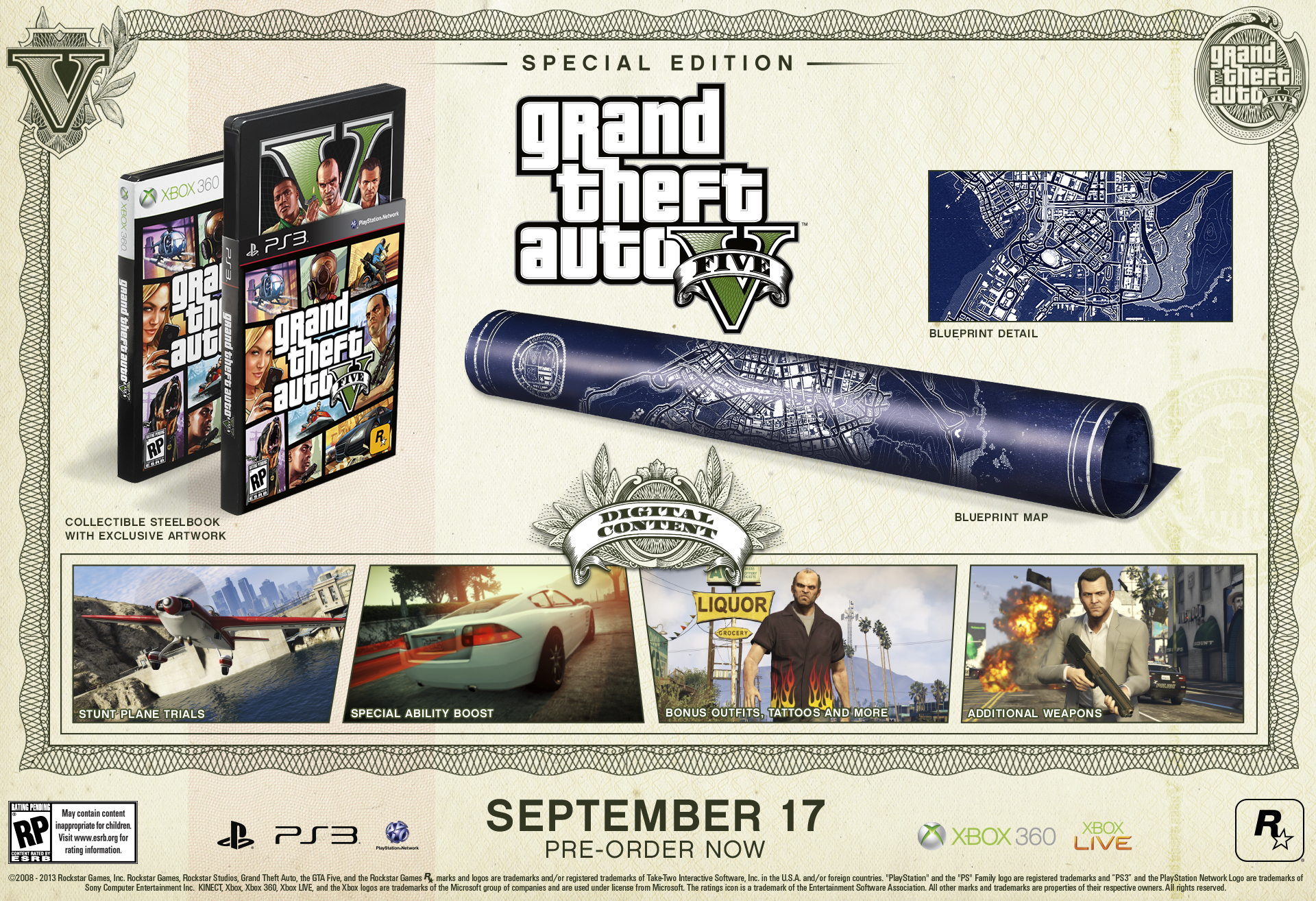 L’atteso Grand Theft Auto V avrà la Special e la Collector’s Edition. Lo ha appena annunciato dal proprio sito ufficialeRockstar Games, publisher e sviluppatore del free-roaming a “sfondo criminale” che debutterà il 17 settembre su PlayStation 3 ed Xbox 360. Sono anche aperte le prevendite presso i più importanti rivenditori. Chi prenoterà il gioco avrà come bonus l’Atomic Blind, un dirigibile, per solcare i cieli di Los Santos, l’enorme metropoli del gioco. L’edizione per collezionisti di Grand Theft Auto V sarà venduta a 149,99 dollari, mentre la Special Edition a 79,99 dollari. I contenuti, piuttosto allettanti per gli appassionati che avranno tanta roba in più sia nella confezione che in game con contenuti esclusivi da scaricare, sono illustrati nelle due immagini che alleghiamo.