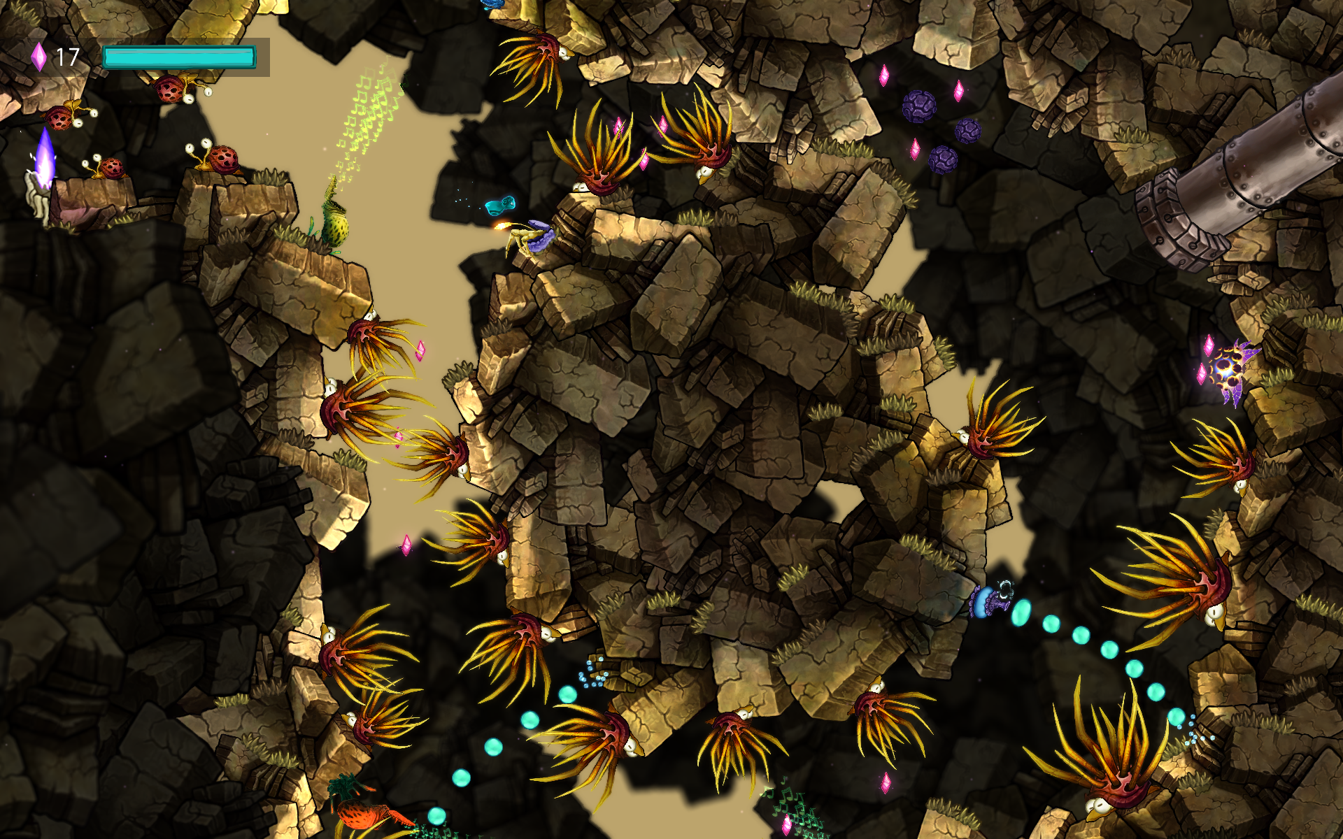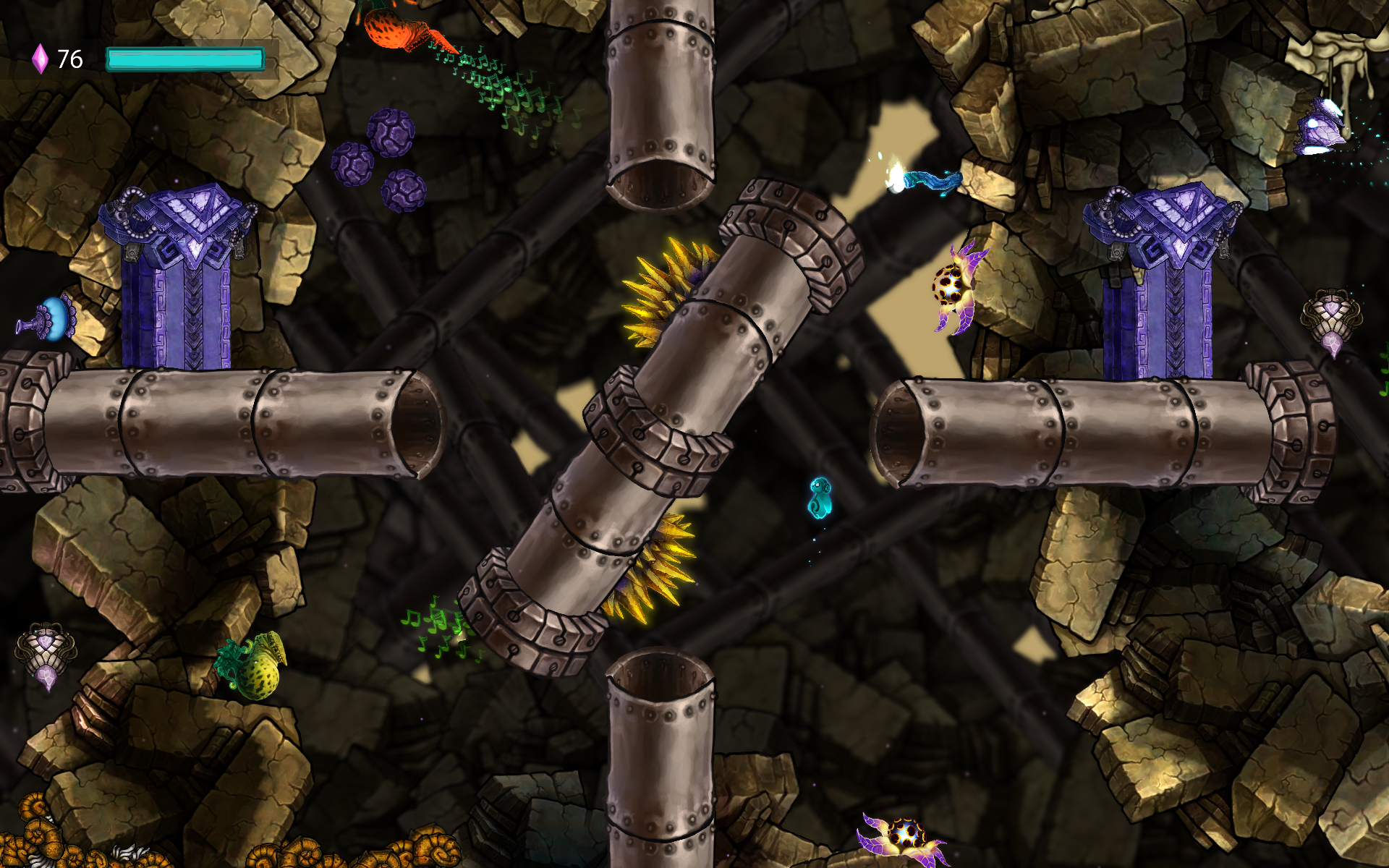 Beatbuddy: Tale of the Guardians racconta la storia di una creatura blu eterea che si risveglia dal suo sonno eterno per salvare la musica nel mondo di Symphonia dal Principe Maestro.