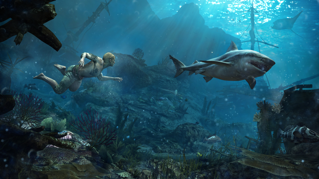 Questo è uno di quei post da ammirare piuttosto che da leggere. Ammirare per le belle immagini di gioco ed artwork dedicate ad Assassin’s Creed IV: Black Flag in arrivo a fine ottobre su Xbox 360, PlayStation 3 e Wii U e successivamente su Pc e console Next-Gen come PlayStation 4 ed Xbox One. Vediamo così screenshots di gameplay del venturo capitolo della serie action-adventure di Ubisoft che vede Edward Kenway, il nonno di Connor (la stella di Assassin’s Creed III), scorrazzare per il mar dei Caraibi in molteplici avventure piratesche e non solo. Lo vedremo anche sott’acqua in compagnia di un simpatico squalo ed altro ancora. L’atmosfera piratesca che si respira negli artwork che ci mostrano anche alcune fasi del combattimento navale con immagini che sembrano più dei dipinti. Bando alle ciance, vi lasciamo alle immagini ed agli artwork.