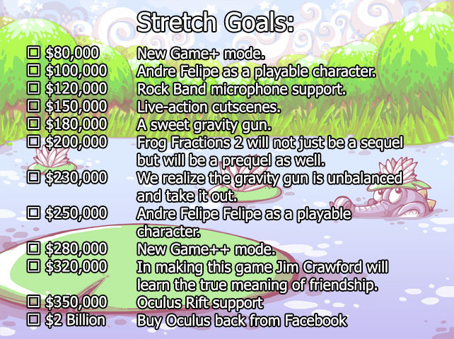 Prima Notch che ha cancellato il progetto Minecraft per Oculus Rift, ed ora anche gli sviluppatori di Forg Fractions 2 (Twinbeard) che, in cerca di fondi per finanziare il loro titolo su Kickstarter (per la cronaca devono ancora raggiungere l’obiettivo minimo ma hanno ancora tempo, ndr); hanno aggiunto in modo sottilmente ironico e provocatorio l’obiettivo secondario posto proprio a 2 miliardi di dollari.