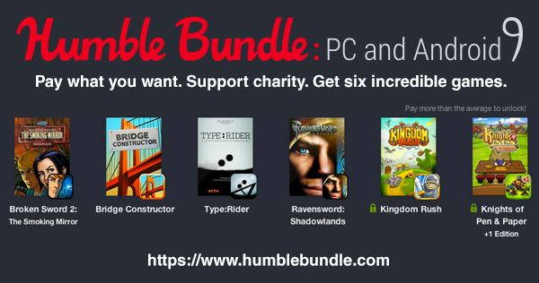 Superando l’offerta media (posta ad ora a 3,79 dollari) si potranno scaricare anche Kingdom Rush; Knigts of Pen & Paper ed altri giochi che, come abbiamo già accennato, saranno aggiunti tra qualche giorno. L’humble Bundle 9 Pc e Android rimarrà disponibile per l’acquisto per due settimane.