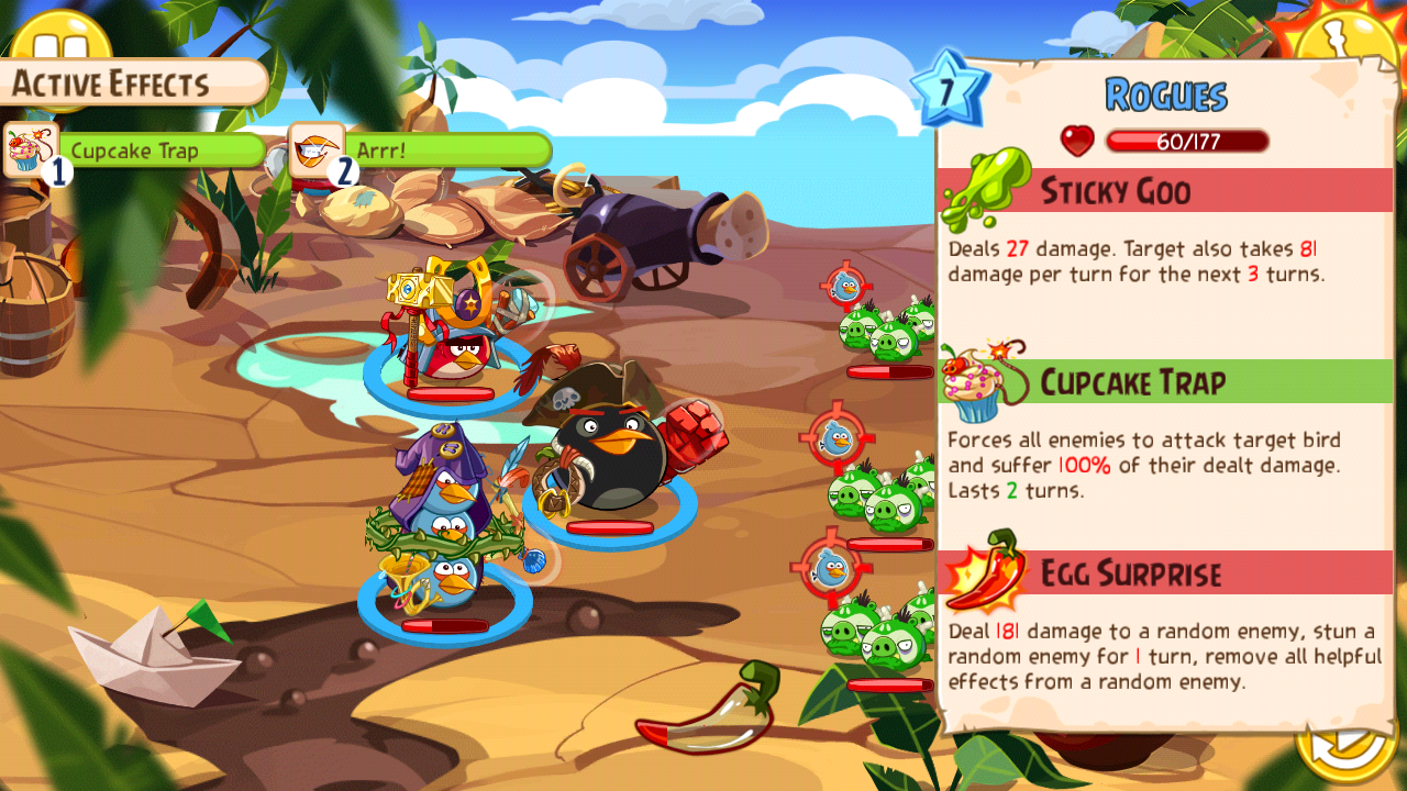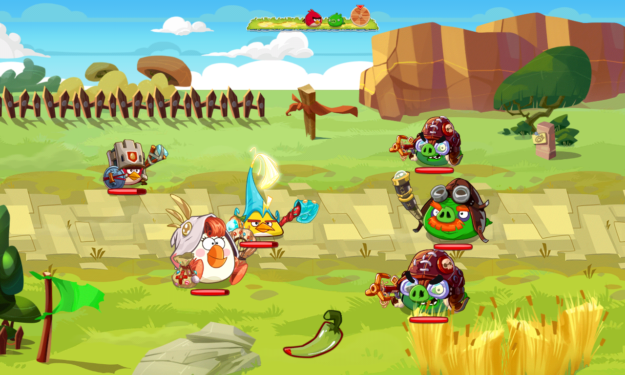 Ogni personaggio, che man mano si sblocca e si va aggiungere al party, ha le proprie caratteristiche. E nell’ottica Epic Fantasy, Red (il famosissimo protagonista della serie) si trasforma in un cavaliere con scudo, spada ed armatura; Chunk (l’uccellino a forma di triangolo giallo) diventa un mago, la gallina Matilda veste i panni di una guaritrice di supporto, Bomb ha le sembianze di un pirata piuttosto forte ed i fratellini Jay, Jake e Jim dei furfantelli.