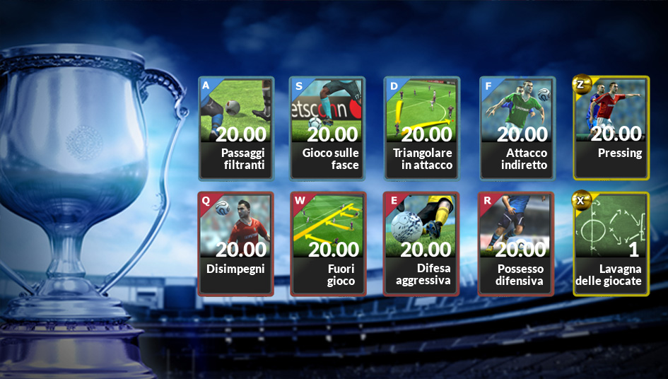 Metti in pratica la tattica che hai sempre avuto in mente. Scegli lo schema di gioco o disegnane uno tuo. La squadra giocherà come tu deciderai ed ogni calciatore assumerà sul terreno di gioco il ruolo specifico da te stabilito.