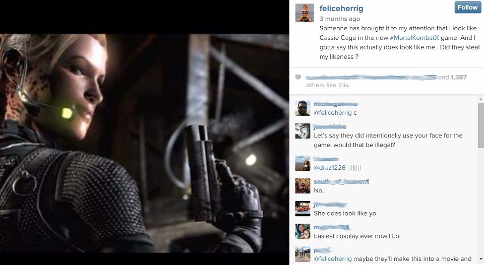 Ne dà notizia Kotaku che mostra anche alcune foto. La Herrig, in sostanza, ha il netto sospetto che NetherRealm Studios abbia utilizzato la sua immagine senza la dovuta autorizzazione dicendo apertamente che esistono troppe somiglianze tra lei e Cassie Cage. Così tante che non possono non essere una coincidenza.