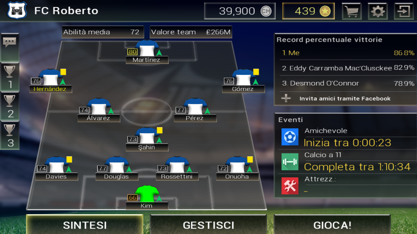 Si seleziona la squadra in un database con oltre migliaia di giocatori. Esaminate il mercato dei trasferimenti per scovare la prossima superstar in un database con oltre 20.000 giocatori, o puntate sui giocatori più quotatati e forma la squadra dei vostri sogni. Ma per guidare la vostra squadra alla vittoria si dovrà migliorare lo stadio, allenare i giocatori e panificare tattiche e formazioni per sconfiggere i vostri amici e gli altri giocatori.