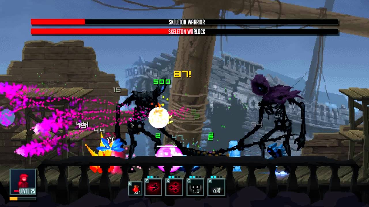 Note positive dal comparto tecnico. La grafica è molto carina. L’occhio vuole la sua parte e l’aspetto di Warlocks vs Shadows è interessante richiamando col suo stile in pixel art i titoli dell’era ad 8 e 16 bit. L’azione si svolge in arene a scorrimento orizzontale, un po’ sullo stile dei vecchi beat’em up o shoot’em up, con la presenza di alcune piattaforme.