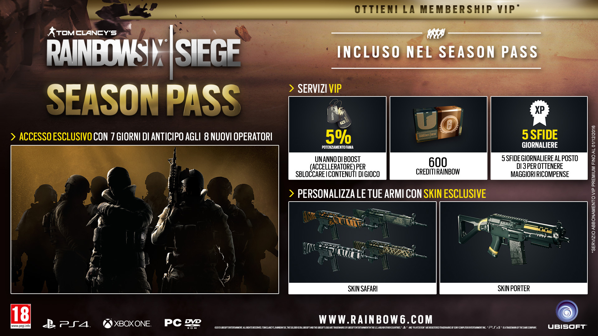 Ubisoft svela maggiori dettagli sul Season Pass di Tom Clancy’s Rainbow Six Siege, gioco che sarà disponibile a partire dall’1 dicembre prossimo su Pc, PlayStation 4 ed Xbox One. L’acquisto permetterà di accedere in anticipo e subito ai nuovi operatori, skin per le armi esclusive, un bonus Fama permanente per sbloccare più rapidamente i nuovi contenuti e molto altro ancora.