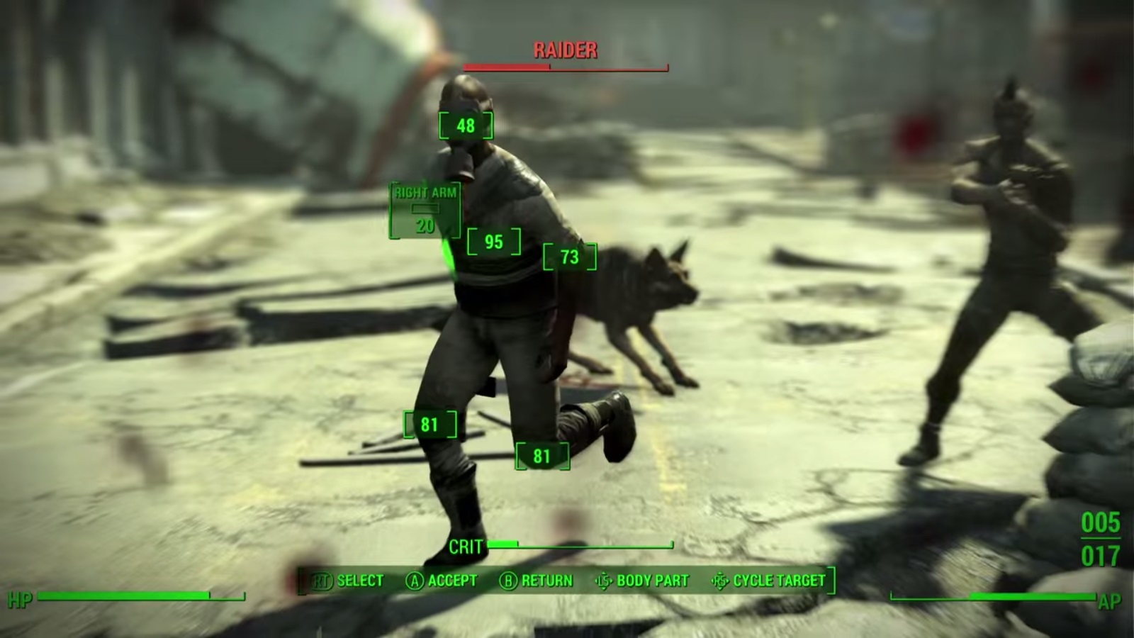 Una sorta di pausa tattica che è davvero molto comoda ma che può essere utilizzata solo dopo il riempimento della barra dei punti azione (una sorta di stamina). Ovviamente si può combattere anche in tempo reale ma a rischio e pericolo. E’ più opportuno ed efficace utilizzare, quando possibile il V.A.T.S utile anche per tentare di centrare più bersagli con una azione singola.