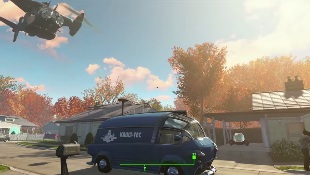 Fallout 4 inizia con un’ambientazione futuristica nel 2077. Il protagonista (o la, è possibile scegliere il sesso e dare un nome al nostro personaggio) è una persona comune che abita in una piccola cittadina americana Sanctuary Hills, nei pressi di Boston, che sembra essere uscita dal telefilm “Happy Days”. Come in Fallout 3, infatti, l’impatto futuristico è mitigato dall’aspetto in stile anni ’50 del XX secolo con design che riportano decisamente a quell’epoca.