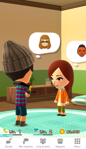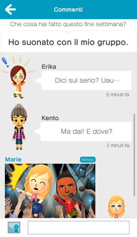 Una volta che il Mii è pronto, gli utenti possono aggiungere gli amici di persona o attraverso gli account esistenti di Facebook o Twitter. Una volta completato questo passaggio, è ora di rispondere a qualche domanda. Miitomo crea conversazioni e trasforma le discussioni in forma di gioco chiedendo agli utenti di rispondere a vari tipi di domande. Lo sai che il cibo preferito della tua migliore amica è la pizza? Sai che il suo genere musicale preferito è la polka? E che pensa che gli alieni esistano? Le risposte verranno condivise tra gli amici, scatenando interessanti conversazioni. Parte del divertimento è proprio scoprire fatti sorprendenti sugli amici di cui eri all’oscuro. Gli utenti potranno interagire con le risposte degli amici mettendo un cuore o aggiungendo un commento sia sotto forma di testo che di immagine.