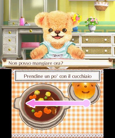A Orsetto piace anche mangiare e i bambini potranno giocare con divertenti minigiochi via Touch Screen per preparare una serie di pasti per sfamarlo. Ma fate attenzione: a volte il cibo sarà troppo caldo e il giocatore dovrà soffiare sul microfono per raffreddarlo! Orsetto a volte mangerà e si sporcherà, pertanto sarà necessario pulirlo un pochino dopo il pasto.