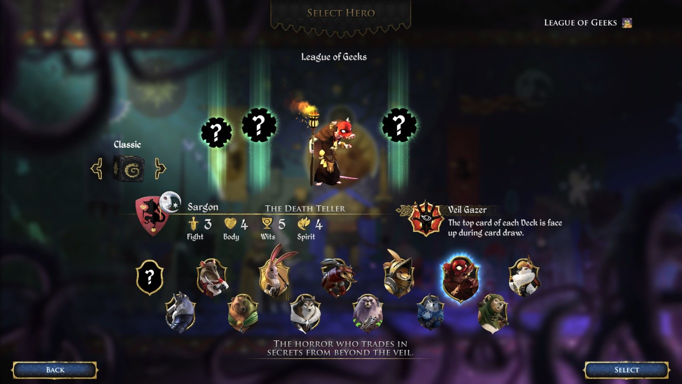 Sargon, il Narratore di Morte: l’ultimo arrivato al Clan del Ratto ha statistiche ugualmente distribuite ed equilibrate, ma il suo potere eroico è “Velo Gazer” che lo rende una scelta accattivante per i giocatori cervellotici. Sargon ha l’abilità di vedere le carte prima che essere vengano disegnate, donandogli un vantaggio strategico su ogni altro personaggio.