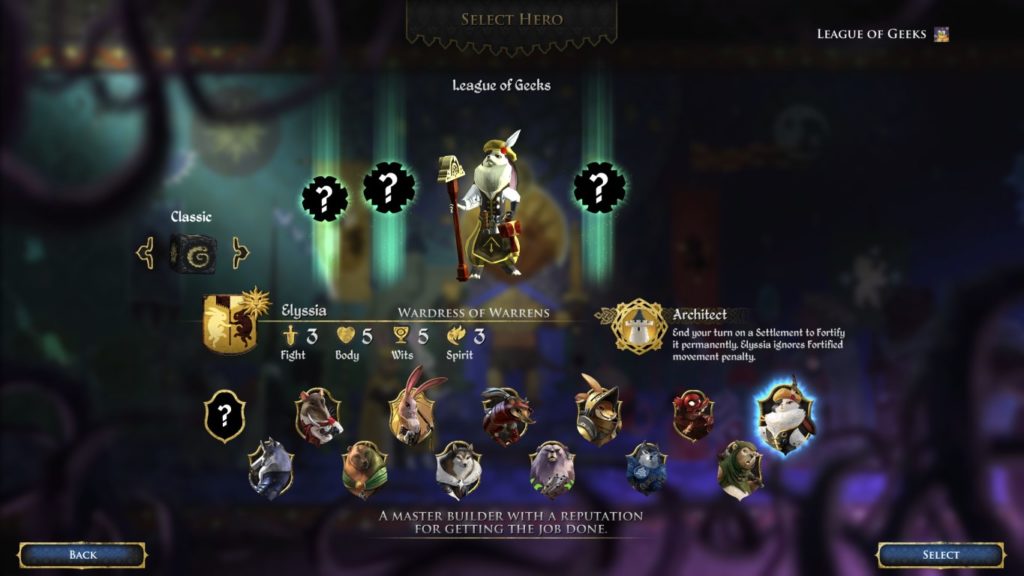 Elyssa, la Guardiana dei Warrens: un eroe del Clan del Coniglio che può fortificare permanentemente gli insediamenti grazie alla sua abilità “Architetto”, che garantisce ad Elyssa un maggiore controllo della ricompensa giornaliera di oro per mantenere gli insediamenti. Pur non essendo la più forte nei combattimenti diretti, la sua alta statistica “Ingegno” e l’abilità di monopolizzare l’economia di Armello la rendono parecchio pericolosa.