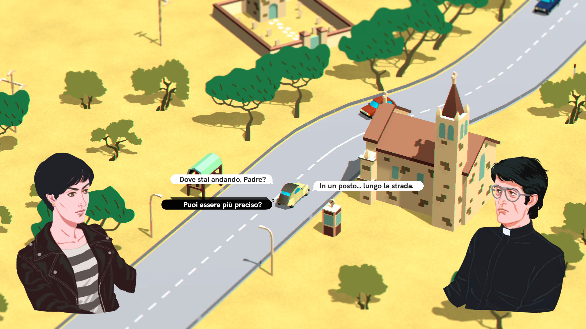 Il gioco vero e proprio comincia con Lella ed Olga in auto verso l’uscita di Roma. L’inquadratura è dall’alto (a volo d’uccello) e ci mostra l’auto che controlliamo, i ritratti dei personaggi ai lati ed i vari dialoghi con risposte multiple (raramente più di tre).