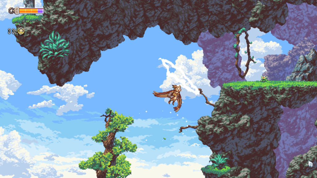Owlboy si sviluppa in un mondo totalmente di fantasia, in cui grossi frammenti di superficie fluttuano in pieno cielo e su cui sono state costruite case e strutture. Un’ottima “scusa” per poter delineare e dipingere scenari e panorami mozzafiato, che non mancheranno di stupire per la loro qualità e dinamicità. Esatto, perché, a parte un ciclo notte e giorno con misure “di mezzo” annesse, il titolo annovera scenari animati, in grado di risultare non solo quindi vivi ma anche fonte di diletto per gli amanti dei dettagli.