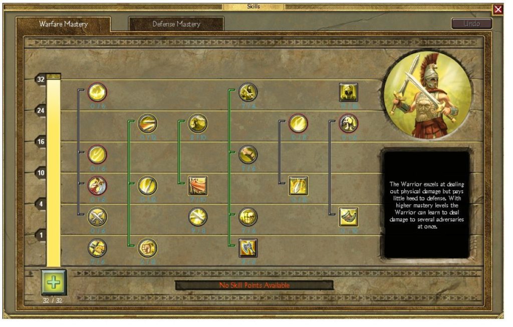 Altra caratteristica peculiare di Titan Quest è la doppia maestria Al primo level up sceglieremo la prima classe del nostro eroe. Ce ne sono nove e queste generano altre classi che cambiano totalmente il gameplay e rendono lo studio di una build piuttosto complessa. Desiderate un tank piromante esperto di fuoco? Lo potete fare, o un assassino in grado di conoscere veleni per offendere e trucchi per curarsi? Perché no? Titan Quest ripropone tutto questo. Se siete appassionati di tank e quindi di eroi senza poteri sovrannaturali l’unione tra Combattimento e Difesa darà vita al Conquistatore, una sorta di spartano. Ecco una comoda tabella che riassume tutte le combinazioni:
