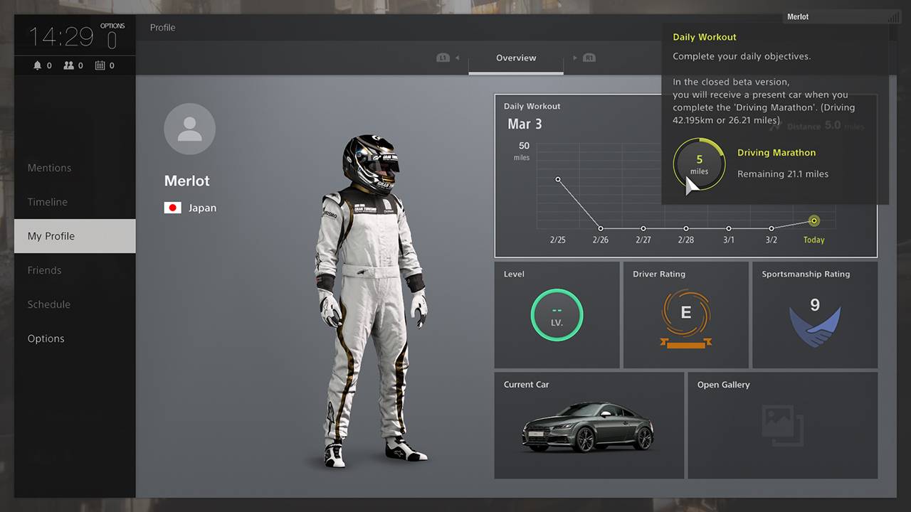 I partecipanti potranno scegliere fra una gamma di vetture e tracciati selezionati giornalmente, per gareggiare online contro altri giocatori, durante le fasi della Beta. La scelta di vetture e percorsi varierà durante il periodo: faremo in modo di offrire diverse classi di vetture e varie tipologie di percorsi, per mettere alla prova gli appassionati di GT nel modo migliore.