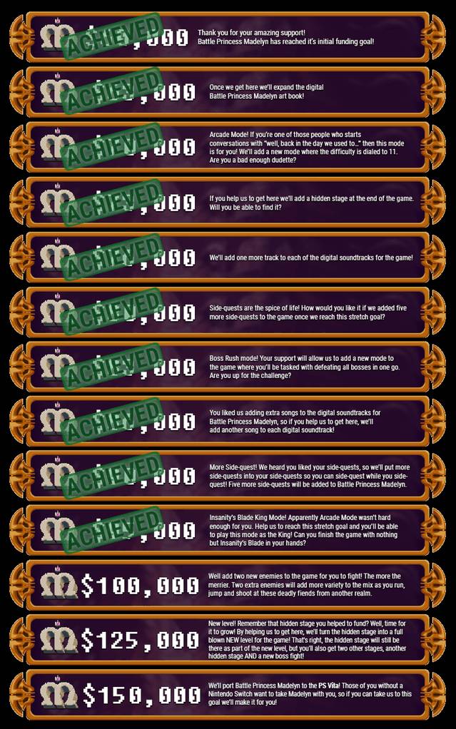 Gli obiettivi secondari prossimi al raggiungimento sono tre. Quello posto a 100.000 dollari aggiungerà altri due nemici al lotto delle creature da combattere; a 125.000 sarà aggiunto un nuovo livello completo mentre a quota 150.000 Battle Princess Madelyn sarà appannaggio anche degli utenti PlayStation Vita.