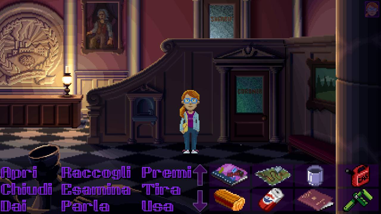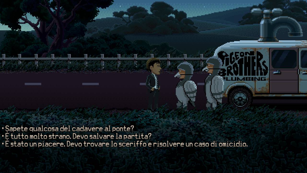 Il gioco è molto divertente: leggere ed ascoltare i dialoghi ci ha strappato in diverse occasioni tanti sorrisi. Una summa di leggerezza scanzonata, tipica di un gioco che non vuol prendersi tanto sul serio ma che effettivamente lo è per tanti motivi unita ad una solidità mirabile. Ma non finisce qui: anche andare avanti nel racconto da vivere dall’inizio alla fine tutta d’un fiato, scoprire location nuove, risolvere enigmi ed ascoltare qualche brano ci ha dato soddisfazione videoludica ed artistica.Tecnicamente, infatti, ci troviamo di fronte ad un signor lavoro con un’ambientazione coerente e forte, una Pixel Art d’autore, un design eccellente, ed un comparto sonoro ben realizzato in tutte le sue sfumature: dagli effetti sonori ai brani di sottofondo delle radio, al doppiaggio. Ci fa piacere citare l’ottima realizzazione dei testi in italiano: una volta tanto la nostra lingua viene trattata bene. Ad impreziosire il tutto anche un gameplay decisamente equilibrato con enigmi mai troppo difficili (si ma non impossibili), una varietà di situazioni, luoghi da visitare e cose da fare molto ampia anche in virtù di tante location. Abbiamo parlato di tante chicche, vale la pena citarne altre (che non c’entrano con la trama): sarà molto divertente interagire col telefono visto che nell’elenco telefonico troviamo oltre ai nomi dei personaggi di gioco anche quelli dei sostenitori e degli sviluppatori. Qui si vede la natura indie del progetto con gli sviluppatori che hanno voluto omaggiare così chi ha sostenuto attivamente lo sviluppo del gioco. Chiamando la stragrande maggioranza dei backers ascolteremo il loro messaggio in segreteria personalizzato. Vi consigliamo anche di dare un’occhiata alle librerie ed alla sede del giornale locale per leggere libri e titoli di vecchie edizioni del quotidiano di Thimbleweed.