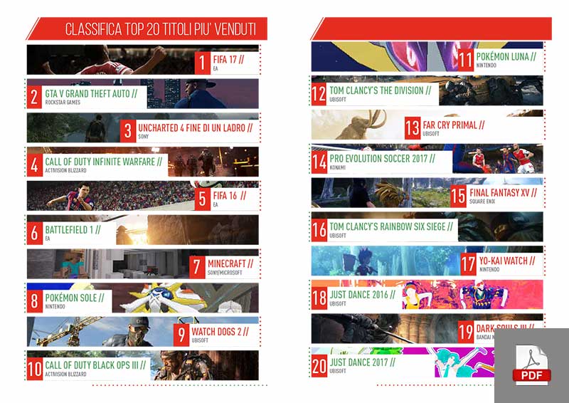Il pdf offre oltre 30 pagine di grafici. Tra i punti salienti: i 20 titoli più venduti nel nostro Paese. Spicca Fifa 17 che supera l’inossidabile GTA V ed Uncharted 4: Fine di un Ladro mentre segnaliamo curiosamente la sesta piazza di Fifa 16. Ecco quindi il rapporto completo che include i grafici di questo “censimento”.