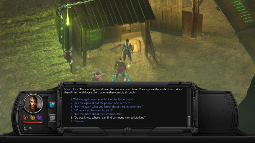 L’approccio è quello dei Gdr tradizionali di fine anni ’90 – ovviamente con qualche necessario ammodernamento – con una visuale dall’alto e un sistema di controllo via mouse che ricorda i titoli strategici. Il gioco presenta una notevole ricchezza di missioni e sottomissioni affrontabili dal giocatore, il quale avrà sempre a sua disposizione un’ampia varietà di modi per affrontarle. Ogni quest, infatti, fornisce diversi tipi di risoluzioni possibili a seconda delle inclinazioni del personaggio che il giocatore decide di sviluppare, dalla rapidità di mano alla persuasione, che il sistema di regole interno del gioco raggruppa genericamente in tre macro-categorie: Forza, Velocità e Intelletto. Passivamente, le abilità scelte all’inizio con la creazione del personaggio (secondo la classica tripartizione “guerriero/ladro/mago”), e poi sviluppate mediante il tradizionale passaggio di livello con accumulo di punti esperienza, permettono di ottenere maggiori informazioni dal mondo di gioco, attivandosi automaticamente durante le conversazioni per fornire maggiori dettagli, a seconda del contesto, con una sorta di “controllo” sull’abilità necessaria, superato il quale si accederà alle nuove informazioni.