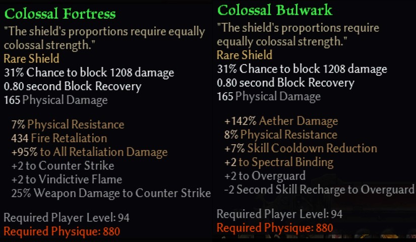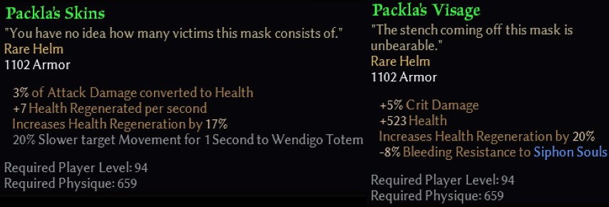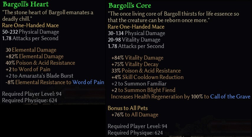 Qui in basso potete vedere alcuni dei nuovi Monster Infrequent che verranno introdotti in futuro nel gioco, nonché le relative statistiche (tenendo ovviamente conto del fatto che si tratta ancora di dati provvisori): si tratta della mazza ad una mano Bargoll’s Heart/Bargoll’s Core, dello scudo Colossal Fortress/Colossal Bulwark, e infine dell’elmo Packla’s Skins/Packla’s Visage.