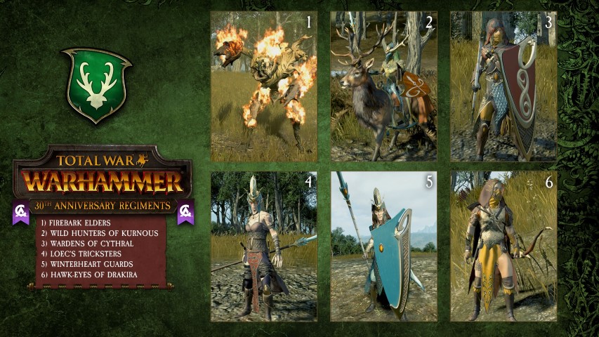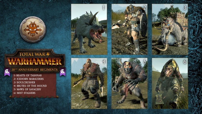 Il secondo DLC rappresenta anche un’occasione per festeggiare degnamente il trentesimo anniversario della nascita di Creative Assembly, e in quanto tale è completamente gratuito (basta iscriversi al servizio ad accesso libero Total War Access): si tratta di 30 unità scelte per gli eserciti del gioco che non hanno ancora ricevuto questo trattamento (ricordiamo infatti che sono già usciti dei reggimenti d’élite per le quattro fazioni originali), ovvero Bretonnia, gli Elfi Silvani, gli Uominibestia, il Caos e la stessa Norsca.
