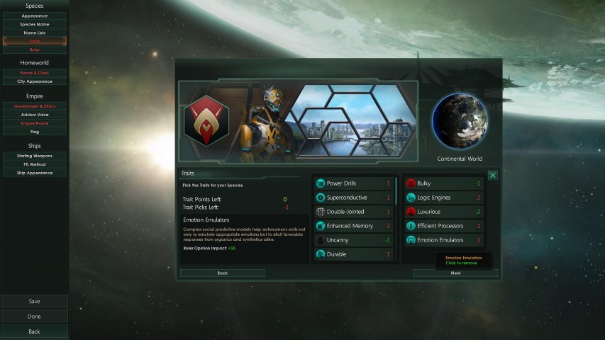 Come già detto, Synthetic Dawn inserisce nel gioco la possibilità di comandare nazioni interstellari interamente sintetiche, le quali gestiranno i propri rapporti con gli altri imperi (organici o macchine anch’essi) in modo diverso a seconda delle proprie origini e delle proprie direttive – ma questo lo vedremo meglio in seguito.