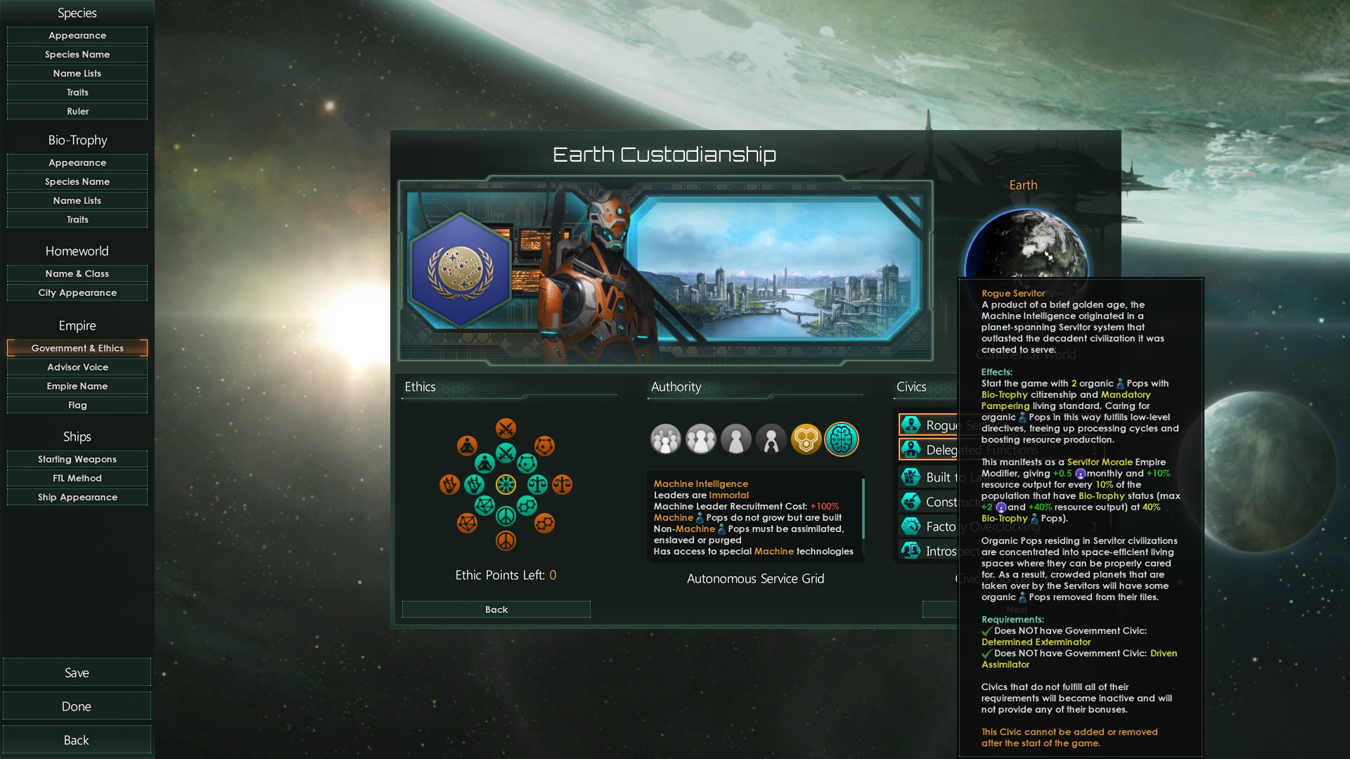 Una quarta possibilità ricca di fascino è altresì quella di creare una fazione personalizzata senza alcuna delle tre “civic” sopracitate: il risultato sarà un popolo sintetico ignaro delle proprie origini e adattabile a qualsiasi politica.