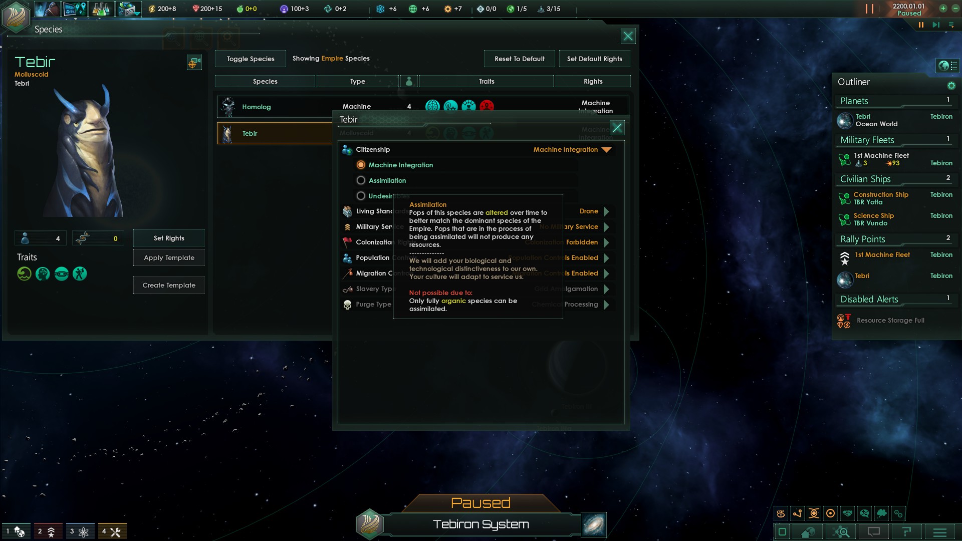 Altre specie incontrate nel proprio cammino possono avere accordato questo tipo di cittadinanza mediante l’apposita opzione presente nel pannello di gestione delle specie; tale meccanica, apparentemente frustrante e sbilanciata dato che i bio-trofei non producono nulla se non una quantità esigua di unità, apre invece le porte ad elemento davvero interessante, che è il “morale dei servitori” – nulla di più e nulla di meno che la felicità dei robot. La loro prima direttiva è infatti la protezione degli organici, e più sono numerosi questi ultimi, maggiore sarà il morale del resto della popolazione, cosa che restituisce utili bonus di influenza e produzione. L’aspetto veramente interessante di questo tipo di civiltà è dunque la necessità di giostrare continuamente tra organici e sintetici, cosa che rappresenta forse la vera essenza filosofica di questo dlc narrativo.