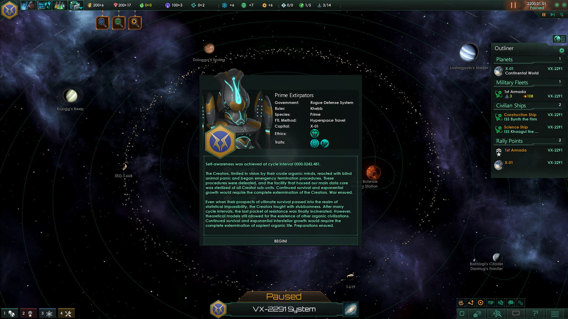 Sono tre le “civic” – ovvero dei determinati caratteri con i quali è possibile personalizzare la propria razza – di gran lunga più importanti per le macchine, che permettono tre tipi di filosofie radicalmente diverse fra loro: la prima di esse si chiama Determined Exterminators, ovvero “sterminatori determinati”, e com’è facilmente presumibile denota una civiltà che, sulla scia di Skynet da Terminator, è votata interamente alla distruzione delle forme di vita organiche. Seguendo tale politica, le razze organiche sotto il proprio controllo verranno automaticamente sterminate, mentre la diplomazia sarà addirittura disattivata del tutto; chiaramente, si tratta del sentiero più pesantemente votato alla guerra e alla distruzione, il che non è certo un gran motivo di pregio data l’assoluta basilarità del sistema di combattimento di Stellaris.
