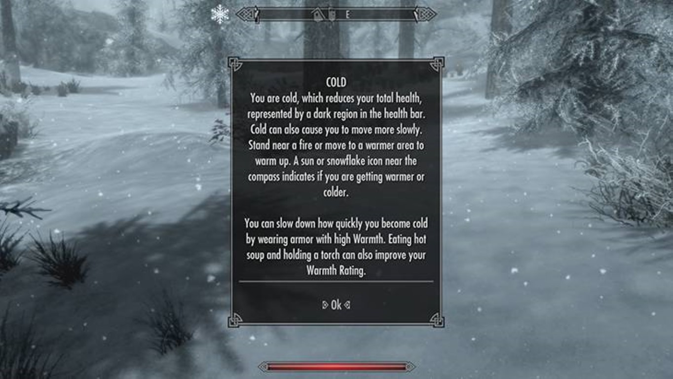 Il gelo di Skyrim adesso è un nemico vero e proprio. Viaggiare sotto la neve o la pioggia aumenta lo stato di freddo. Man mano che il personaggio prenderà freddo, la salute totale (compare una zona scura sulla barra della salute), la velocità di movimento e la capacità di scassinare e borseggiare peggioreranno. Quando si raggiungerà il livello di freddo massimo, la salute si ridurrà a 0 e morirà per l’esposizione agli elementi. I giocatori possono riscaldarsi restando accanto a un fuoco, mangiando una zuppa calda o spostandosi nei pressi di un luogo più caldo. L’icona di un sole o di un fiocco di neve vicino alla bussola indica il vostro stato (caldo o freddo).