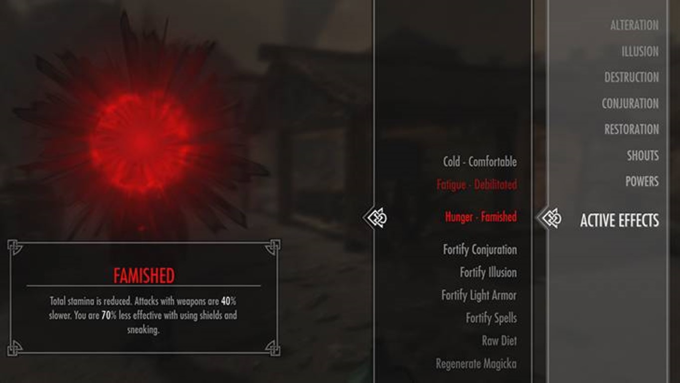 Perfino gli avventurieri più valorosi devono dormire di tanto in tanto. La stanchezza riduce la magicka totale (compare una zona scura sulla barra della magicka), l’efficacia delle pozioni e la capacità di recuperare magicka e vigore. Per recuperare, si dovrà dormire periodicamente in un letto. In modalità Sopravvivenza, il bonus Ben riposato non sarà più conferito automaticamente dopo aver dormito. Se si dormirà all’aria aperta, non sarà possibile passare una notte di riposto totale. Nella migliore delle ipotesi, ci si sveglierà Prosciugati. Dormendo in un letto al chiuso, si avrà il bonus Ben riposato.