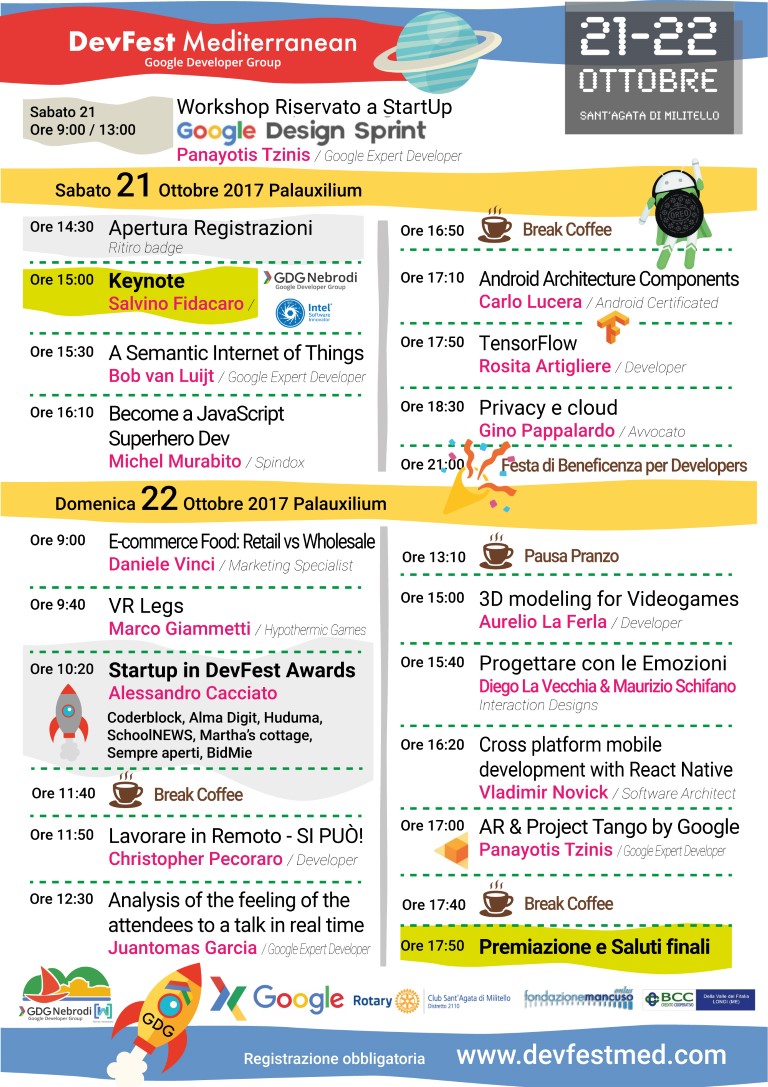 La DevFest Mediterranean 2017 si avvicina e gli organizzatori hanno pubblicato il programma ufficiale dell’evento che si terrà sabato e domenica 21 e 22 ottobre al Palauxilum di Sant’Agata di Militello.