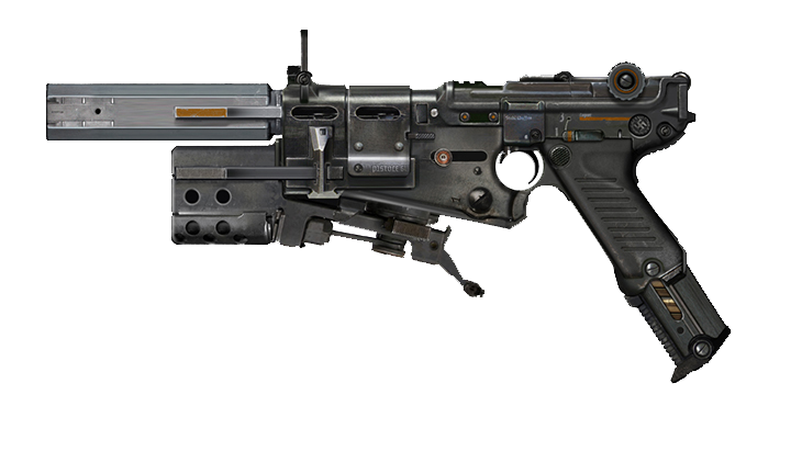 Facile da usare (e ancora più facile da mantenere carica, visto che i comandanti nazisti morti lasciano munizioni a terra in grandi quantità), la pistola è un’affidabile arma secondaria adatta agli scontri a distanza ravvicinata. Nonostante l’umile aspetto, specie se confrontata con le armi più grosse presenti nell’arsenale di B.J., la pistola è in grado di sbarazzarsi facilmente di tutti i nemici non corazzati semplicemente con qualche colpo ben piazzato. La sua efficienza aumenta con i potenziamenti Caricatore esteso (più colpi) e Magnum (più danni).