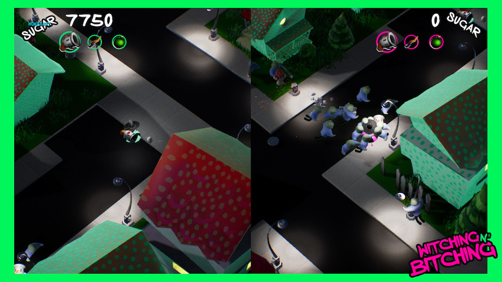 Witching, N ‘Bitching è un gioco multiplayer in 3d in cui due giocatori interpretano il ruolo di una strega in cerca di dolcetti. Entrambi i giocatori sono dotati di qualunque tipo di abilità e di trucco atti a scatenare una battaglia caotica per la cattura dei dolci, che potrebbe esplodere in qualsiasi momento.