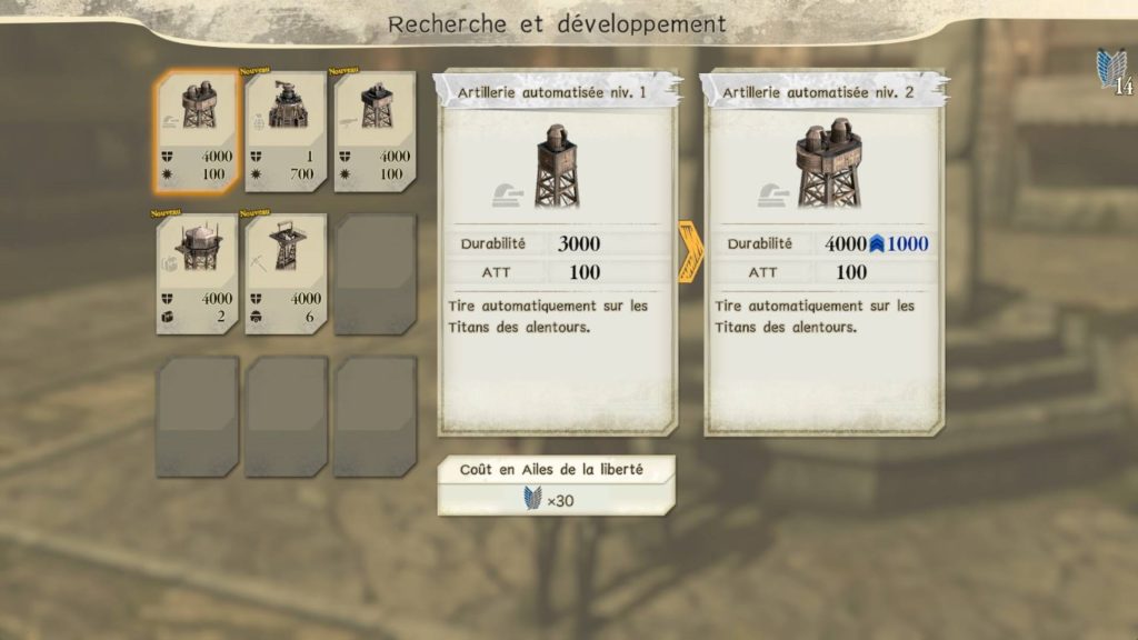 Visitando la Titan Research Room sarà possibile vedere i Giganti catturati utilizzando in battaglia le Restraining Gun, cosi come conoscere meglio delle informazioni che possono aiutarli nei futuri incontri. Per distruggere queste devastanti creature, il giocatore può migliorare il livello delle loro statistiche nel Training Facilities scegliendo tra attività classiche come la lettura oppure combattimenti di esercitazione con i comandanti alleati.