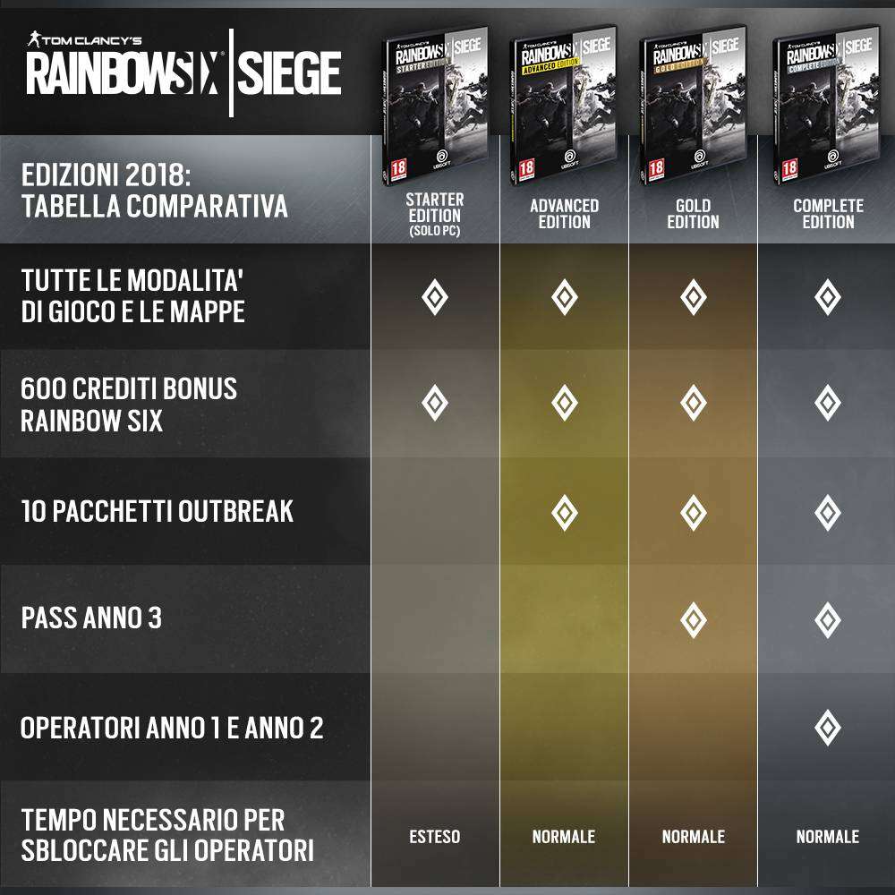 L’Anno 3 di Rainbow Six Siege porta anche nuove edizioni del gioco. L’annuncio è di Ubisoft che svela la Advanced Edition, la Gold Edition e la Complete Edition. Queste saranno disponibili dal 13 febbraio 2018, mentre è già disponibile una Starter Edition.