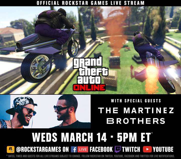 Da oggi, mercoledì 14 marzo, sintonizzatevi alle 22 ora italiana per seguire la diretta streaming ufficiale di Rockstar Games: gli sviluppatori giocheranno alle modalità che questa settimana faranno guadagnare GTA$ e RP doppi in compagnia di ospiti speciali, i Martinez Brothers e i loro amici. Assicuratevi di seguire Rockstar Games su Facebook, YouTube e Twitch per tutti gli aggiornamenti in tempo reale.