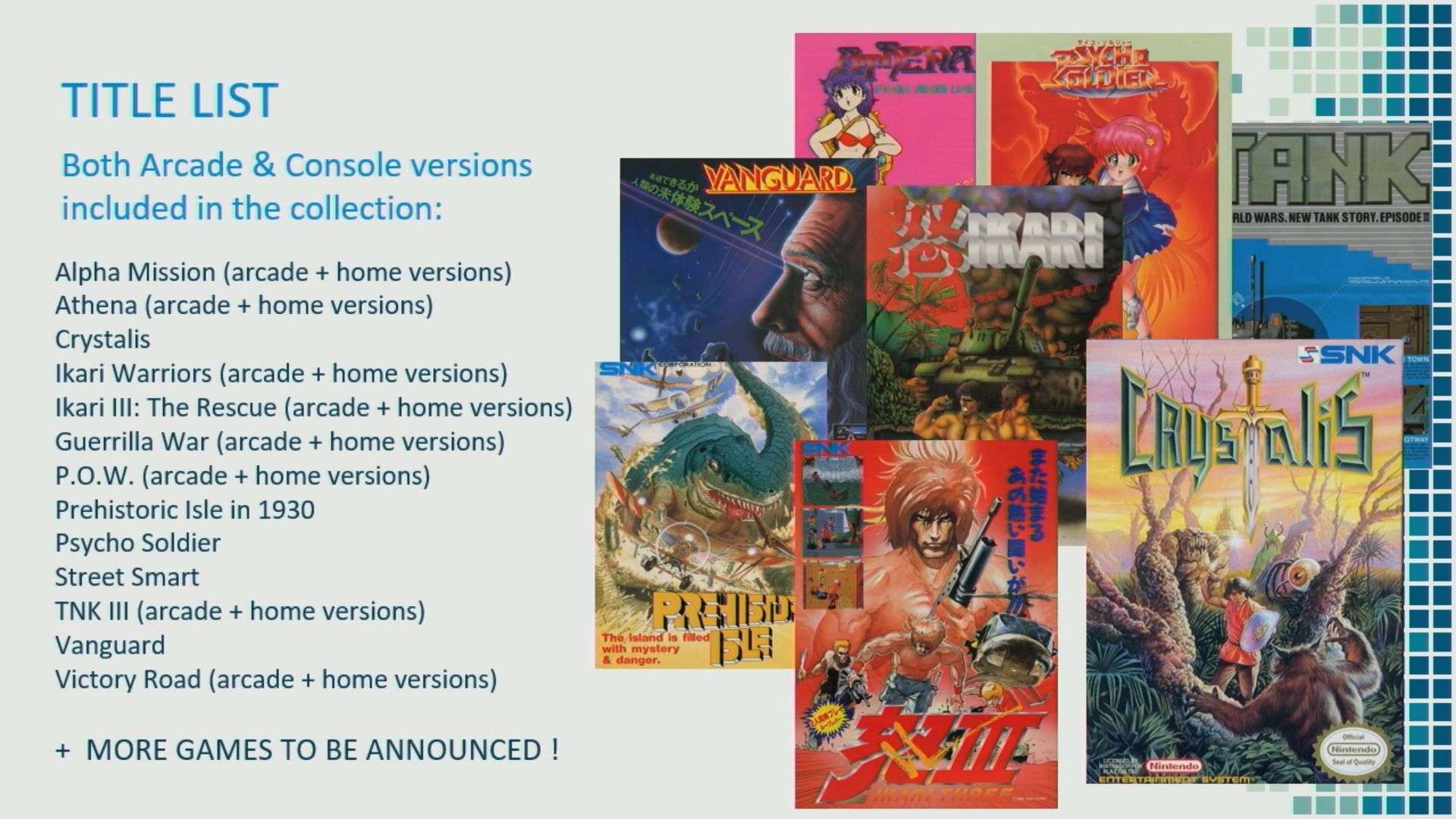 La compilation, di cui non si conosce ancora la data di lancio e pare sia – al momento – una prerogativa solo Switch, includerà alcuni titoli quali Alpha Mission, Athena, Crystalis, Ikari Warriors, Ikari III: The Rescue, Guerrilla War, P.O.W, Prehistoric Isle in 1930, Psycho Soldier, Street Smart, TNK III, Vanguard, Victory Road ed altri giochi che saranno svelati in futuro. Molti hanno la doppia versione: casalinga ed arcade. Ne parla Dualshockers.