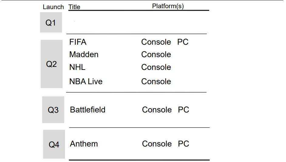 Tra questi spicca Anthem, il nuovo titolo di BioWare di cui non si sa tantissimo ancora, che arriverà entro il termine sopracitato. Nel trimestre che va dal primo luglio al 30 settembre prossimi ci saranno le varie uscite sportive: Fifa (l’unico titolo di questi previsto anche per Pc), Madden, NHL ed NBA Live.