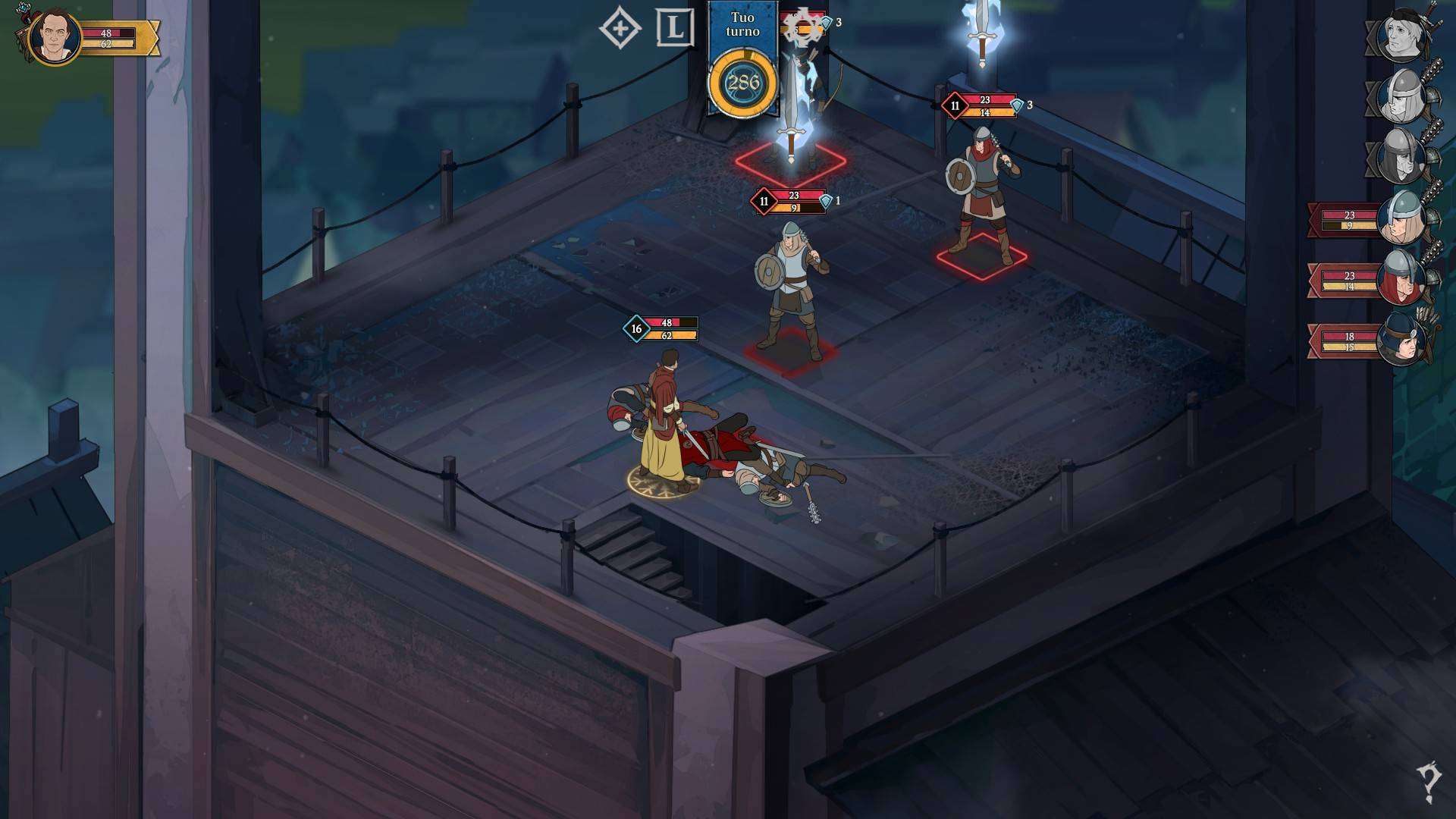Il personaggio poi può decidere se fare un’azione passiva come ad esempio ampliare la propria difesa o altro. Ci sono azioni che non concludono il turno per cui è possibile anche attaccare. Ogni componente del gruppo ha le proprie caratteristiche non solo in statistiche ma anche nel tipo di attacco e di colpi speciali. Ci sono alcune classi che sono in grado di fare danni multipli, altri di concentrare le forze in un attacco unico e letale, altre ancora mobili nei movimenti ed in grado di attaccare a distanza, o ancora c’è chi può guarire i personaggi e così via.