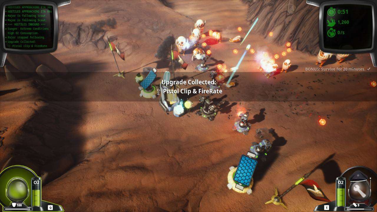 Giocare Mars or Die è divertente come pochi giochi tower defense, d’azione e di strategia. Bisogna tener d’occhio i livelli di ossigeno per non morire prematuramente, occuparsi delle risorse primarie come la più classica tradizione Rts (strategici in tempo reale) e difendere la base da ondate di nemici. Un astronauta pensa ad usare una pistola mentre l’altro adotta uno stile difensivo con una barriera. Il giocatore può controllare solo uno dei due e non essendo prevista una modalità cooperativa, nemmeno in locale, questo risulta essere l’unico neo di un’offerta che, secondo chi vi scrive, ha pochissime debolezze. Come quella di non offrire grosse motivazioni per tornare a rigiocare una volta affrontate tutte le missioni.