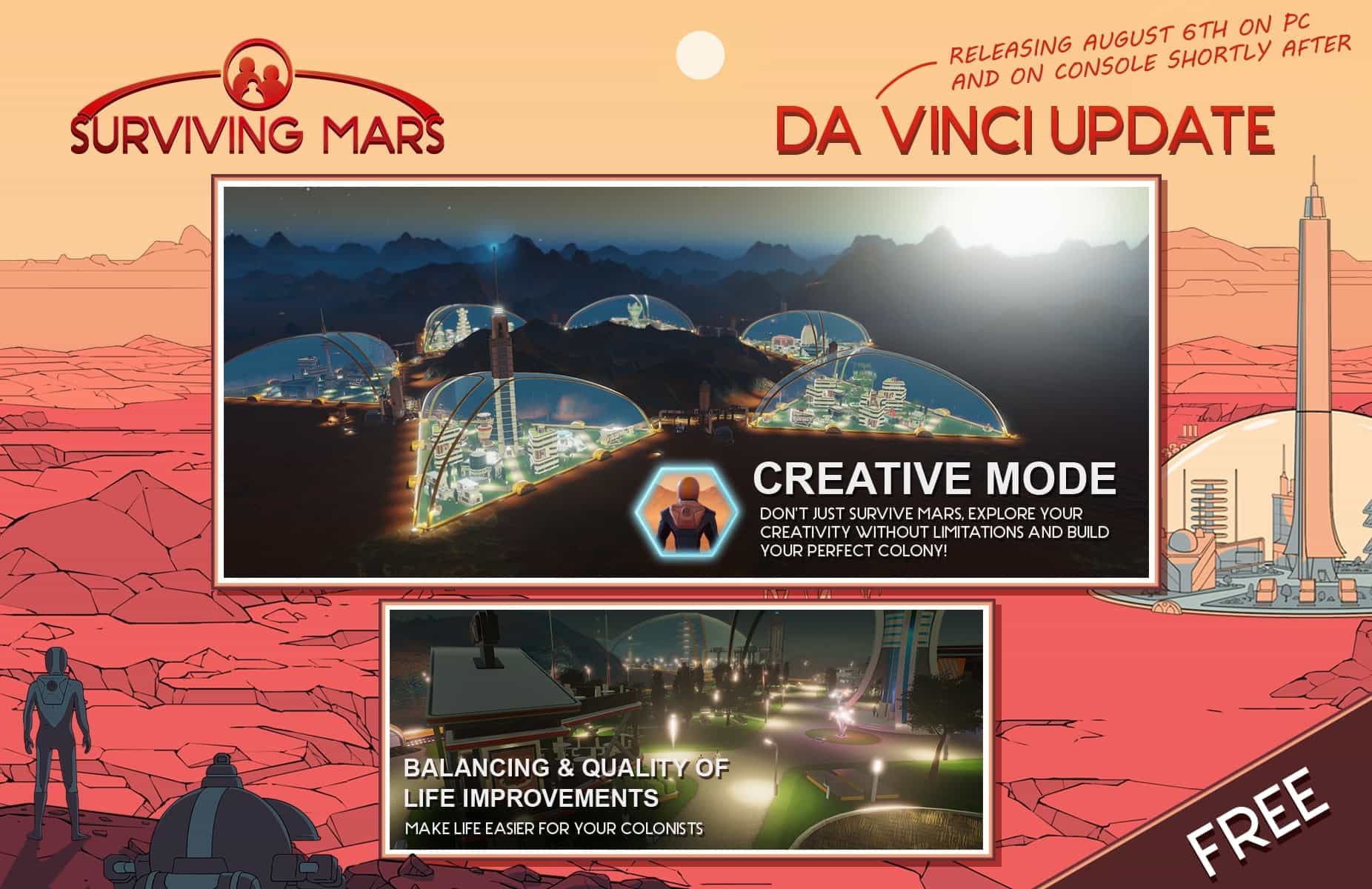 L’aggiornamento “Da Vinci”, già disponibile oggi su Pc e in seguito su console, porta in dote una “modalità creativa”, grazie alla quale i giocatori potranno prendersi diverse libertà in più nella personalizzazione della colonia tese a facilitare il gioco, come strutture che non richiedono manutenzione, soldi in più alla partenza e coloni immortali.