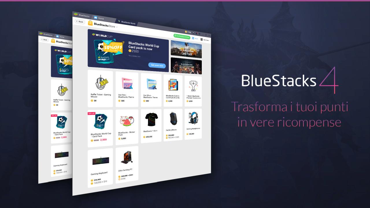Uno tra gli aspetti più interessanti di BlueStacks consiste nella possibilità per gli utenti di guadagnare premi semplicemente giocando, come ha dichiarato il Country Manager per l’Italia Alessandro Capezza. Accumulando BlueStacks point, infatti, gli utenti hanno modo di riscattare premi direttamente dallo store, che vanno da semplici ma affidabili mouse gaming fino ad avanzati e costosi Ultra PC pensati specificatamente per il gaming. In altre parole, continuando a giocare, è possibile accumulare punti che si possono trasformare in premi reali.